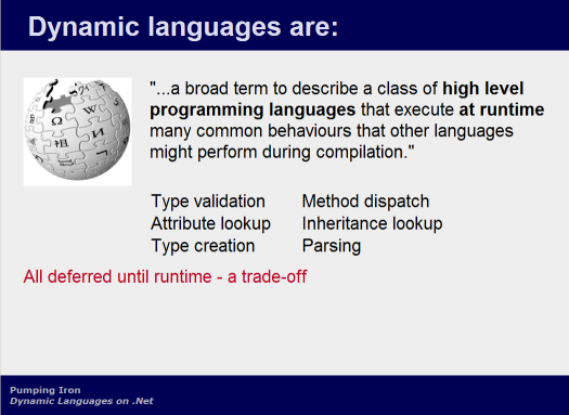 Alright, so what are these features that make a language dynamic? Well Wikipedia's definition is a high-level language that defers a bunch of stuff until runtime.